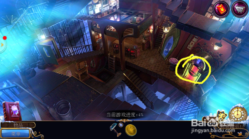 进入后,我们先完当作一个拼图,拼图后进入到一个餐厅。我们先拿到开瓶器、月亮挂饰与汽水。如下图所示位置。然后点击汽水与开瓶器,打开汽水。我们再点击锁的位置,然后用汽水倒在锁上,获得碎瓶子,再点击广场,进入广场。