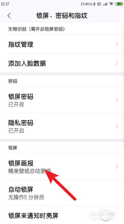 点击年夜红色的设置,然后点击年夜红色的锁屏、密码和指纹。