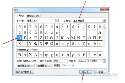 在“子集”中选择“根基希腊语”,并鄙人方选中年夜写希腊字母贝塔Β,点击“插入”。