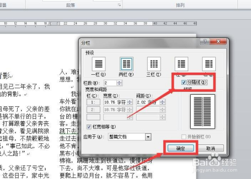 在弹出的“分栏”对话框中,将“分隔线”前面的方框中打钩,然后点击“确定”,这时就会呈现中心的分隔线。
