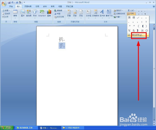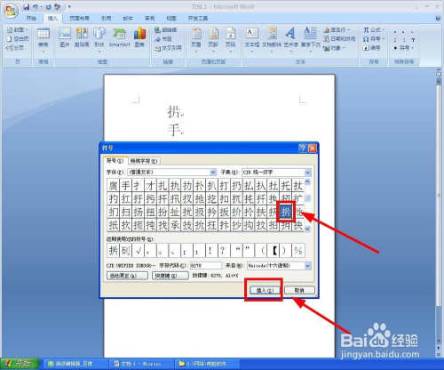 选中“手”字,找到菜单栏中的“插入”选项卡单击