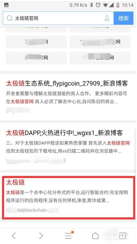 首先打开手机百度,然后在手机百度中输入 太极链官网 然后点击查询,在查询列表中看到taijiblockchain如许的域名的就可以点击进入