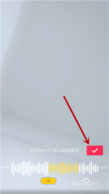 最后在剪音乐里摆布滑动下方的进度,黄色区域暗示裁剪的音乐,裁剪后点击【√】。