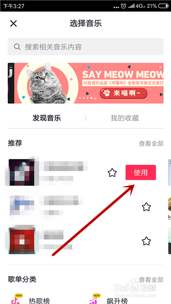 然后在曲库中找到添加的音乐并点击,接着点击【利用】。