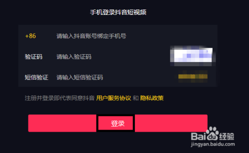 点击后会打开登岸界面,这里需要输入我们抖音账号绑定的手机号和验证码,然后点击【登岸】。