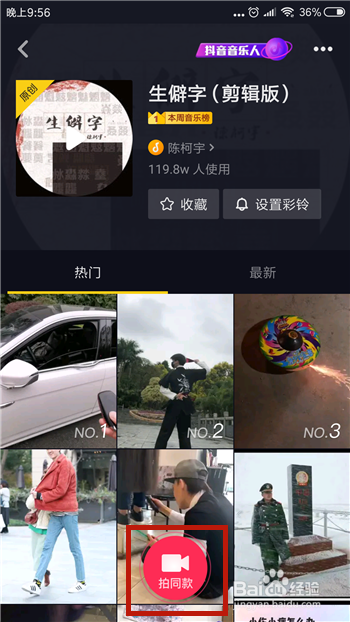 良多人看到热点的榜单音乐可能想要利用来录制视频,这时辰可以点击音乐,然后点击【拍同条目】。
