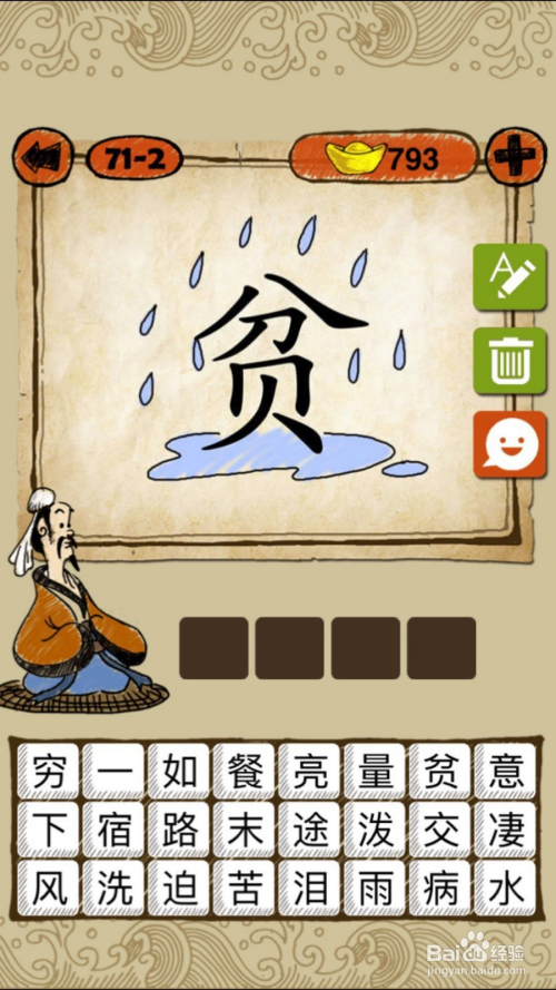 当作语玩命猜第71-2关,如下图,“贫”被水洗了,谜底是一贫如洗。