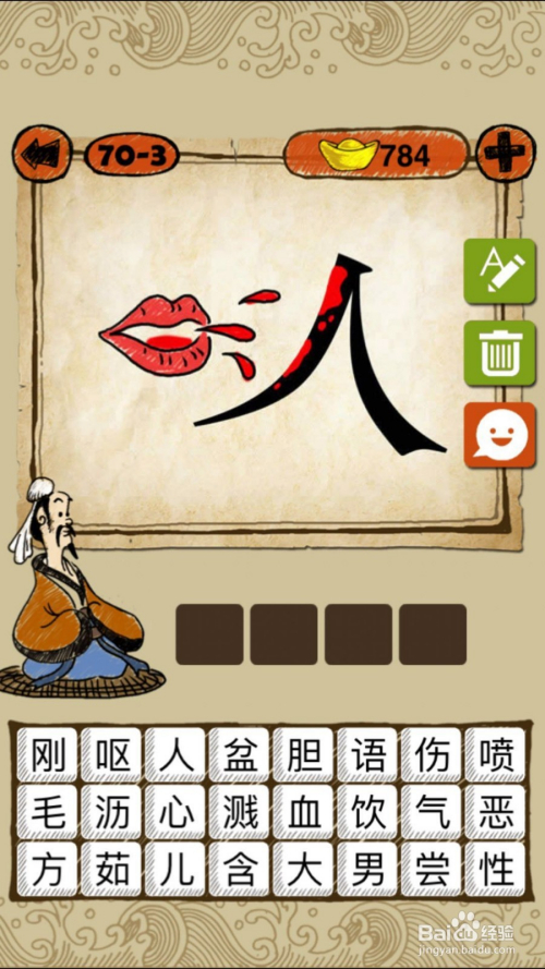 当作语玩命猜第70-3关,如下图,带血的嘴,喷到人身上,谜底是血口喷人。