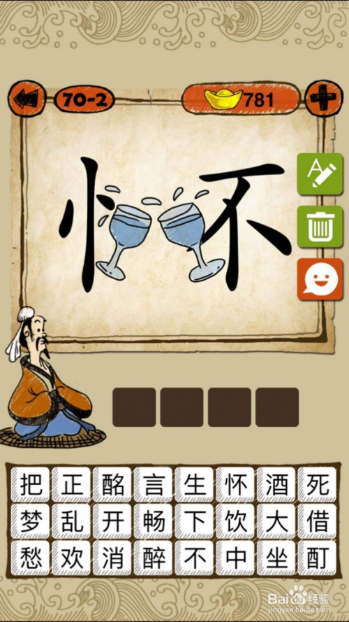 当作语玩命猜第70-2关,如下图,怀字分隔,酒杯利落索性喝酒,谜底是畅怀畅饮。
