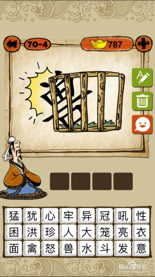 当作语玩命猜第70-4关,如下图,关在樊笼中的兽想逃出来,在挣扎,谜底困兽犹斗。