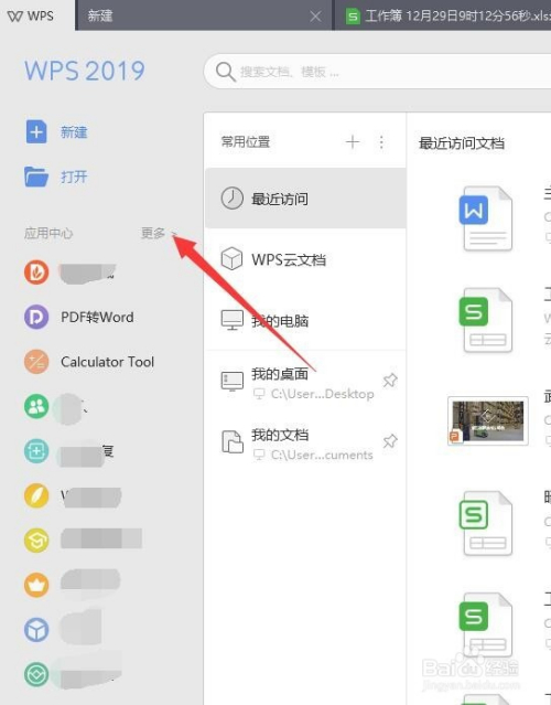 首先点击wps左上角的WPS,然后可以在应用中间中看到更多,点击这个按钮