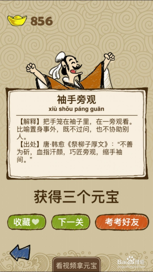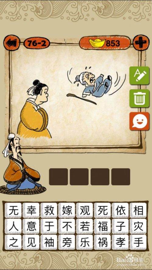 当作语玩命猜第76-2关,如下图,老奶奶摔倒了,一小我在旁边看着,也不帮手,谜底作壁上观。