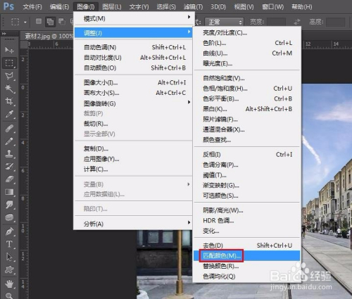 第二步:在需要调整色调的图片操作区,在菜单栏中选择“图像--调整--匹配颜色”选项。