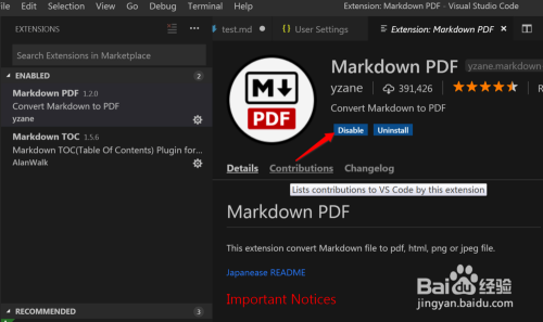 在VSCode中可以看到已经启用的Markdown PDF插件,如下图所示