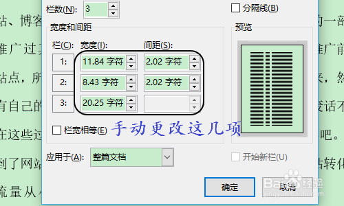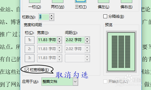然后会弹出分栏对话框,我们首先需要将对话框中“栏宽相等”前面的勾选去失落才行;