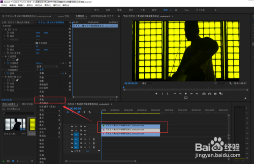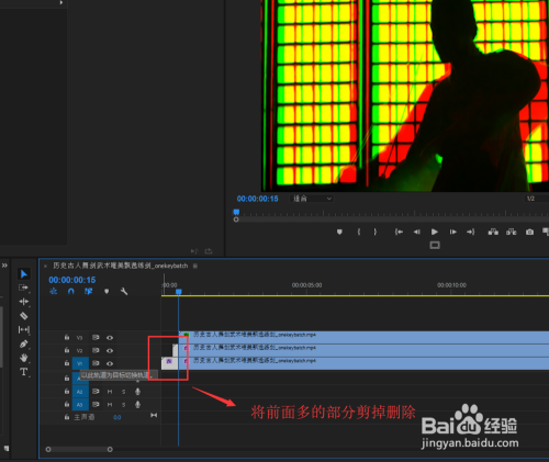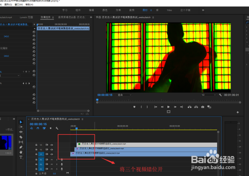 依次选中位于视频轨道2与3上的视频素材,将这两个视频的夹杂模式都改为“滤色”。然后按shift加右偏向键,将三个视频进行错位开来。