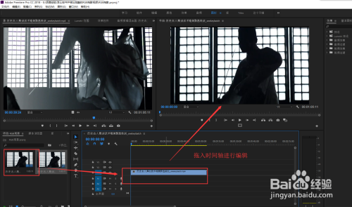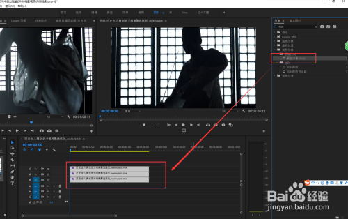 将导入的视频素材进行选中,按住鼠标左键不松将其拖入到时候轴窗口中建立序列并进行下一步的编纂操作。