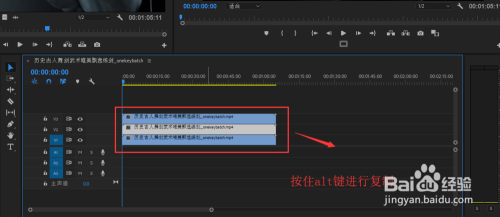 选中视频轨道1中的视频素材,按住键盘上的alt辅助键,将视频素材往视频轨道2与3长进行拖动,获得两个复制素材。