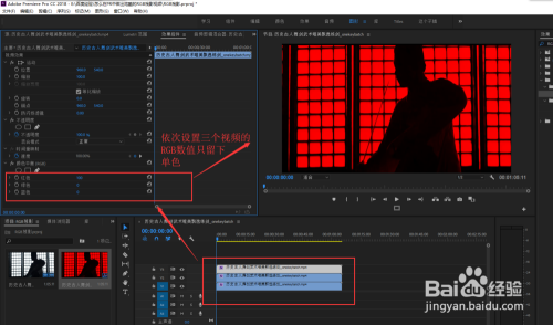 用鼠标框选住三个视频素材,在结果窗口中搜刮“RGB”获得颜色均衡结果,并将该结果施加到三个视频素材上,然后依次选中三个视频素材,在结果控件中调整颜色均衡的RGB数值,别离将三个视频设置当作R,G,B三种颜色对应的单色。