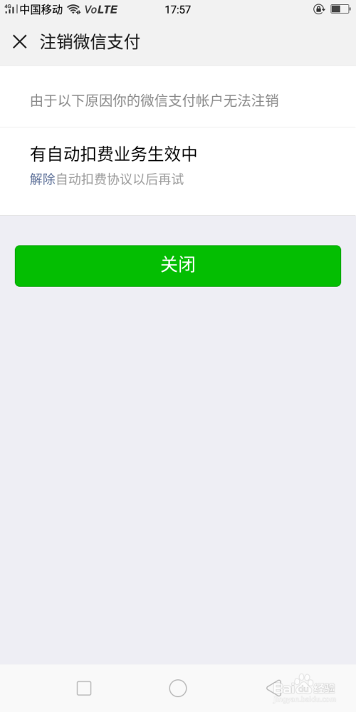 若是你有“主动扣费营业”,一般是无法刊出付出账户的,这里的主动扣费营业,一般是城市公交微信免密付出,打消就好。
