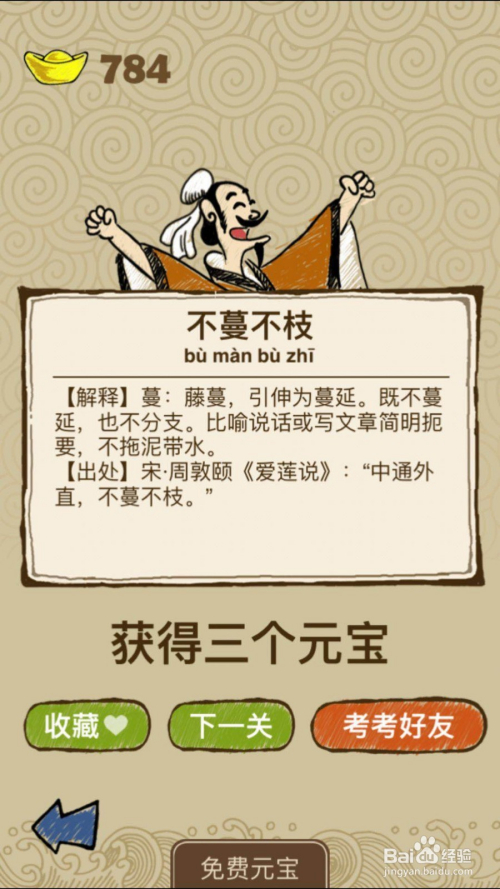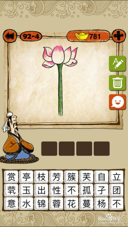 当作语玩命猜第92-4关,如下图, 一朵竖立的荷花,没有弯曲也没有分枝,谜底不蔓不枝。