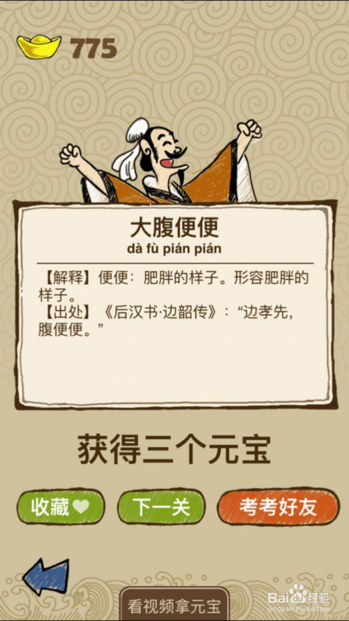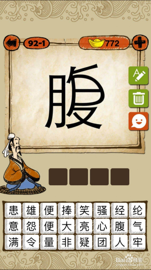 当作语玩命猜第92-1关,如下图, 一个“腹”字的肚子很年夜,谜底脑满肠肥。