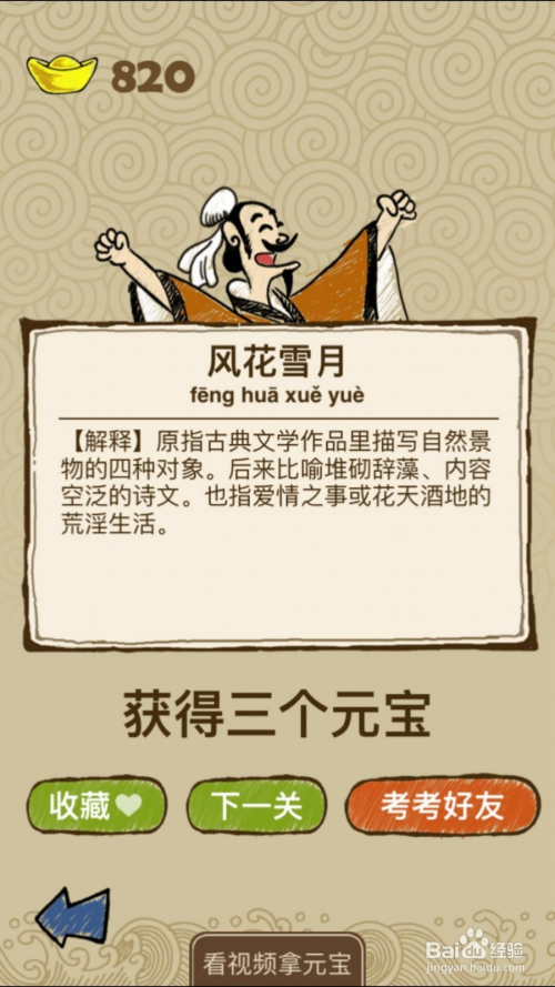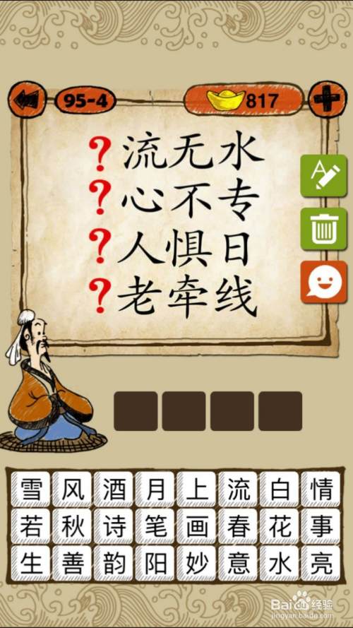 当作语玩命猜第95-4关,如下图, 藏头诗,别离是“风”“花”“雪”“月”,谜底风花雪月。