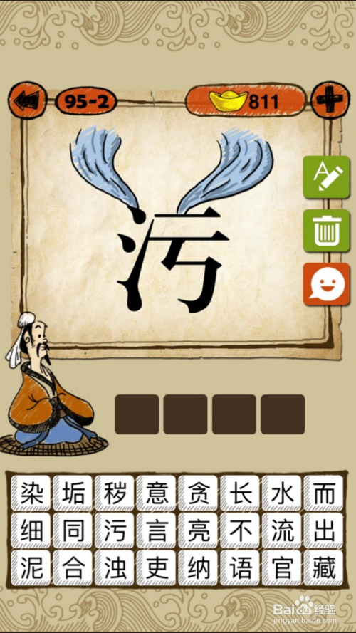 当作语玩命猜第95-2关,如下图, 两股污水汇合到“污”字,谜底随波逐流。
