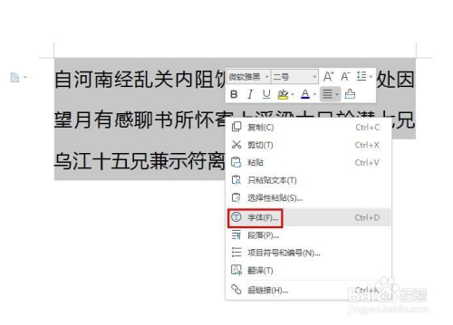 第一步:选中文字,单击鼠标右键选择“字体”。