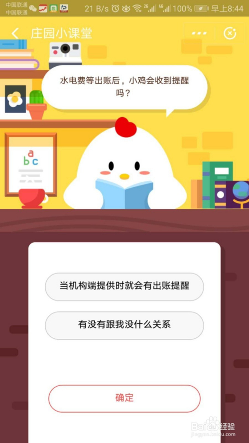 第五步,既然是讲堂,天然就要做题看标题问题,标题问题是水电费出账之后,小鸡会不会收到信息提醒?