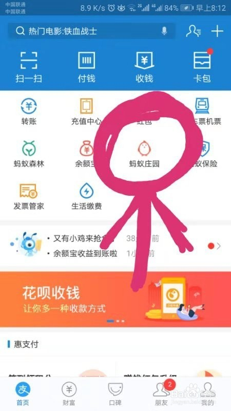 第二步,进入付出宝之后,在本家儿页找到蚂蚁庄园,并点击它,如图所示。