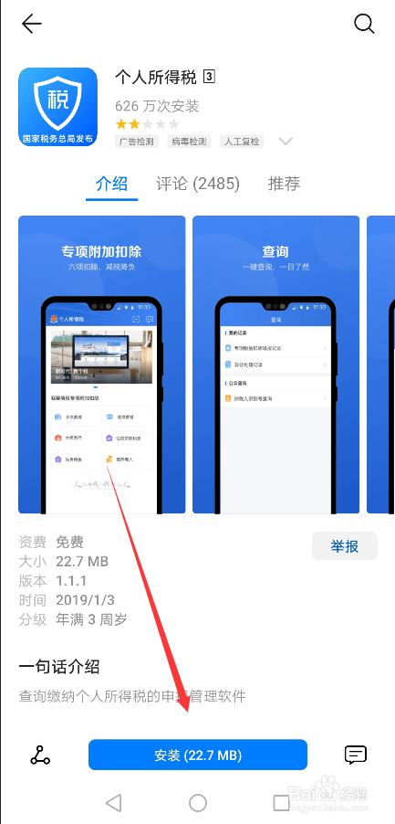 点击进入小我所得税介绍界面后,直接点击下面的安装,也可以直接点击上一步调查询成果后面的安装,如下图所示。