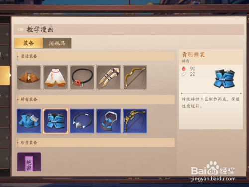 中等装备里的青色装备,好比青羽短裳,第一流的装备是紫色。