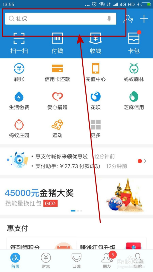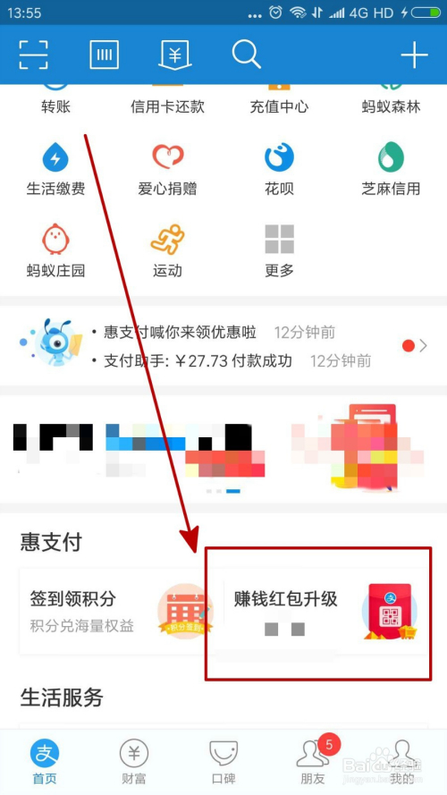 我们进入本身的付出宝之后标的目的下拉可以看到惠付出专栏的“赚钱红包”活动,我们点击进入。