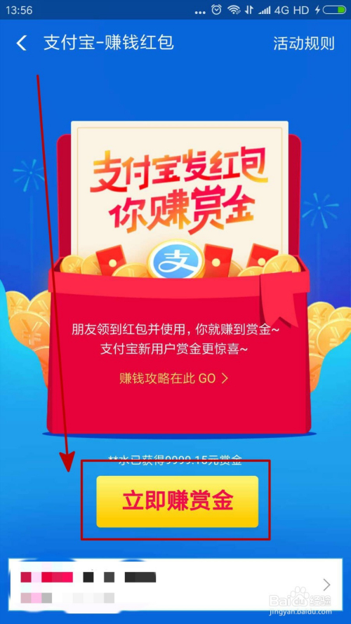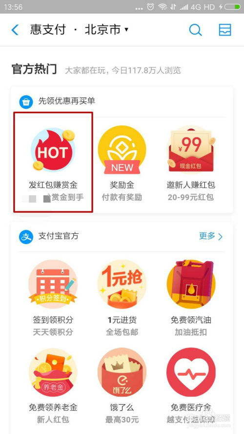 在惠付出界面,我们标的目的下拉,可以看到“发红包赚赏金”活动,我们点击进入。
