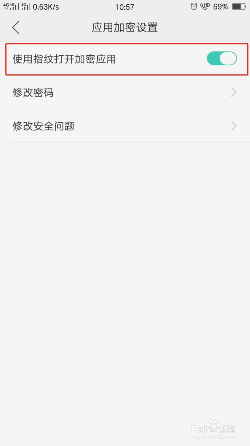 点击右上角的设置按钮,进入到设置界面。可以选择打开或者封闭指纹解锁加密应用