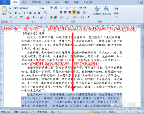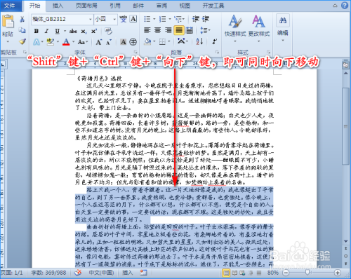 段落第中后,我们同时按住键盘上的“Shift”键+“Ctrl”键不放,若是想让选中的段落只移动一个段落的距离,我们只需点击一下键盘上的“标的目的下”键即可达到结果。如图所示: