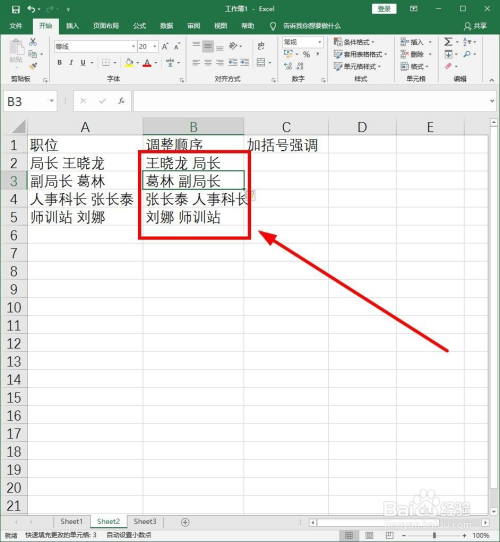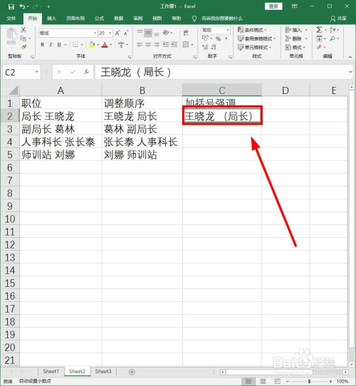 在第三列我们不仅要调整挨次还要给职位加上括号,看可否实现。在C2单位格中输入“王晓龙 (局长)”