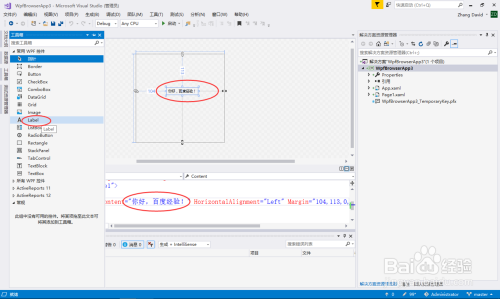 我们在xaml页面中,从左侧拖入一个Label控件,并设置显示内容为“你好,百度经验!”,如下图所示: