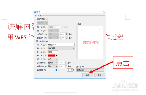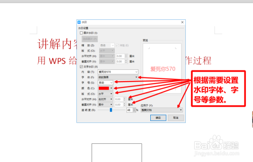 如图,按照需要设置水印的字体、字号等参数,经由过程左边的预览进行调整参数,达到本身的要求。