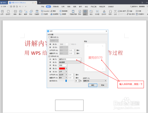 如图,在界面里的内容栏输入水印文字内容,左边的预览窗口就会呈现水印内容。