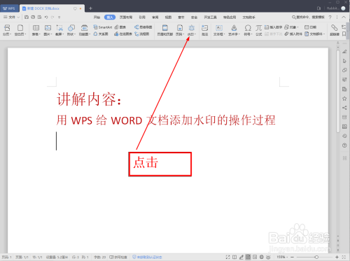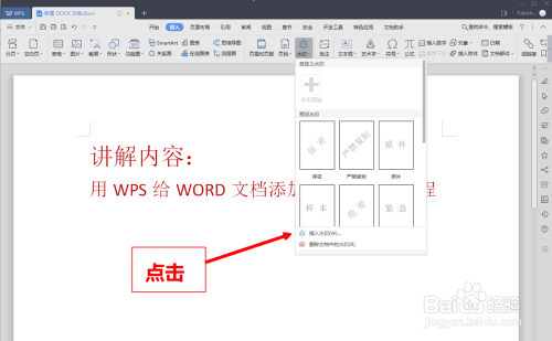 如图,在插入菜单下方的东西栏里找到水印按钮,点击该按钮到下一步。