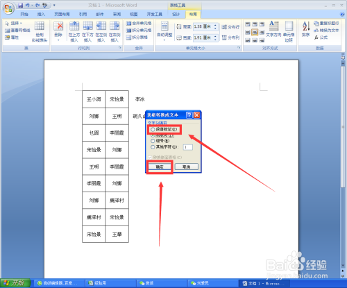在弹出的“表格转换当作文本”对话框,选中“段落标识表记标帜”后单击“确定”