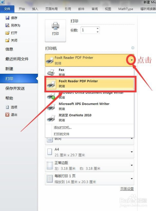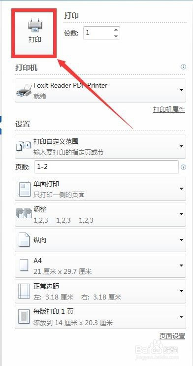 首先在“打印机”选项里面选择合适的打印机,为了打印当作pdf格局,这里选择“Foxit Reader PDF Printer”,即福昕阅读器所配备的打印机功能。