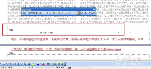 可以经由过程键盘上的左、右偏向键共同空格键,调整页码域的位置,使之与页面协调美不雅;还可以在页码域的两头加上“第”、“页”等文字,使页码看起来像如许:第3页。若是需要显示全数页码,利用numpages,使页码看起来像如许:第3页,共19页。