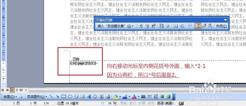 我们以页面分两栏为例会商:在页脚编纂状况下,按一次Ctrl+F9功能键输入一对花括号,然后在花括号中输入一个=号,再按一次Ctrl+F9功能键输入一对花括号,在花括号中输入page,然后标的目的右移动光标至内部花括号的外侧输入*2-1,这是两栏中左边一栏的页码。