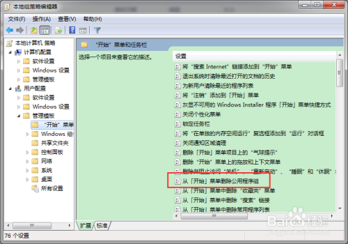 在右侧本家儿窗口中,找到“从开始菜单删除公用法式组”;