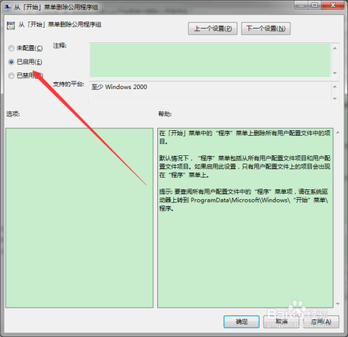 双击设置装备摆设项,打开“从开始菜单删除公用法式组”设置装备摆设窗口;