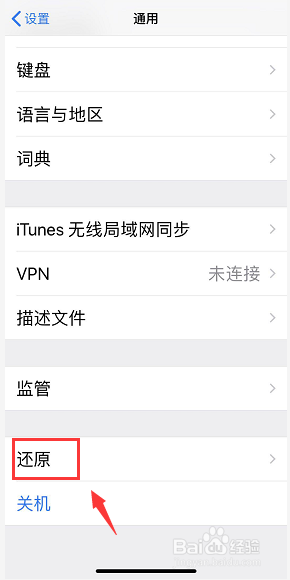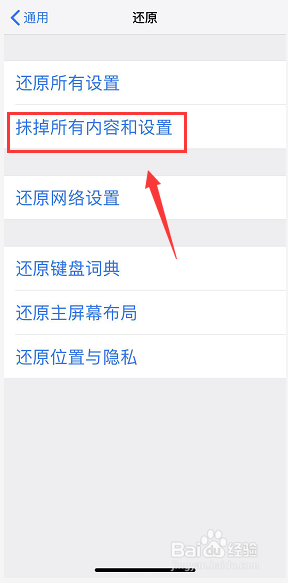 进入还原设置界面,点击抹除所有内容和设置,如下图所示