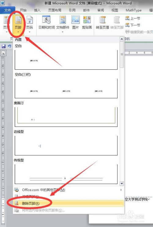 若是想要删除页脚,将鼠标放置在页脚处,然后点击“页脚”,在页脚下选择“删除页脚”,如许页脚就被删除了。